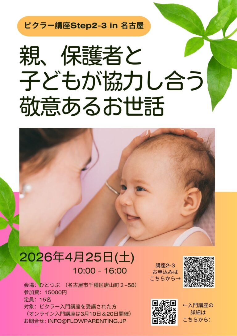日時:2026年4月26日(日) 10:00 – 16:00 会場:京田辺市社会福祉センター (住所:京都府京田辺市興戸犬伏5−8) 参加費:15,000円 対象:ピクラーアプローチ入門講座に参加された方 お問い合わせ/お申し込み:京田辺ピクラーアプローチを学ぶ会 宮原貴子 Eメール:miyahara.takako@gmail.com ピクラー講座Step2-3京都2026