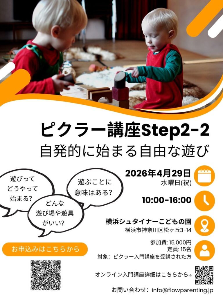 ピクラーアプローチ Step 2-2「自発的に始まる自由な遊び」 赤ちゃんの遊びはどうやって始まる? どうしたら自分で遊べる子どもに育つ? 乳幼児期における遊びとは? そして大人は何ができる? ピクラーアプローチの視点から乳幼児の遊びを理解すると、肩の力を抜いて子育て&保育ができるようになります。 日時:2026年4月29日 日曜日 10:00〜16:00 会場:横浜シュタイナーこどもの園(住所:横浜市神奈川区松ヶ丘3−14) 定員:15名 参加費:15,000円 対象:ピクラーアプローチ入門講座を受講された方 ⚫︎お問合わせ・お申し込み ysteinerhoikuen@gmail.com